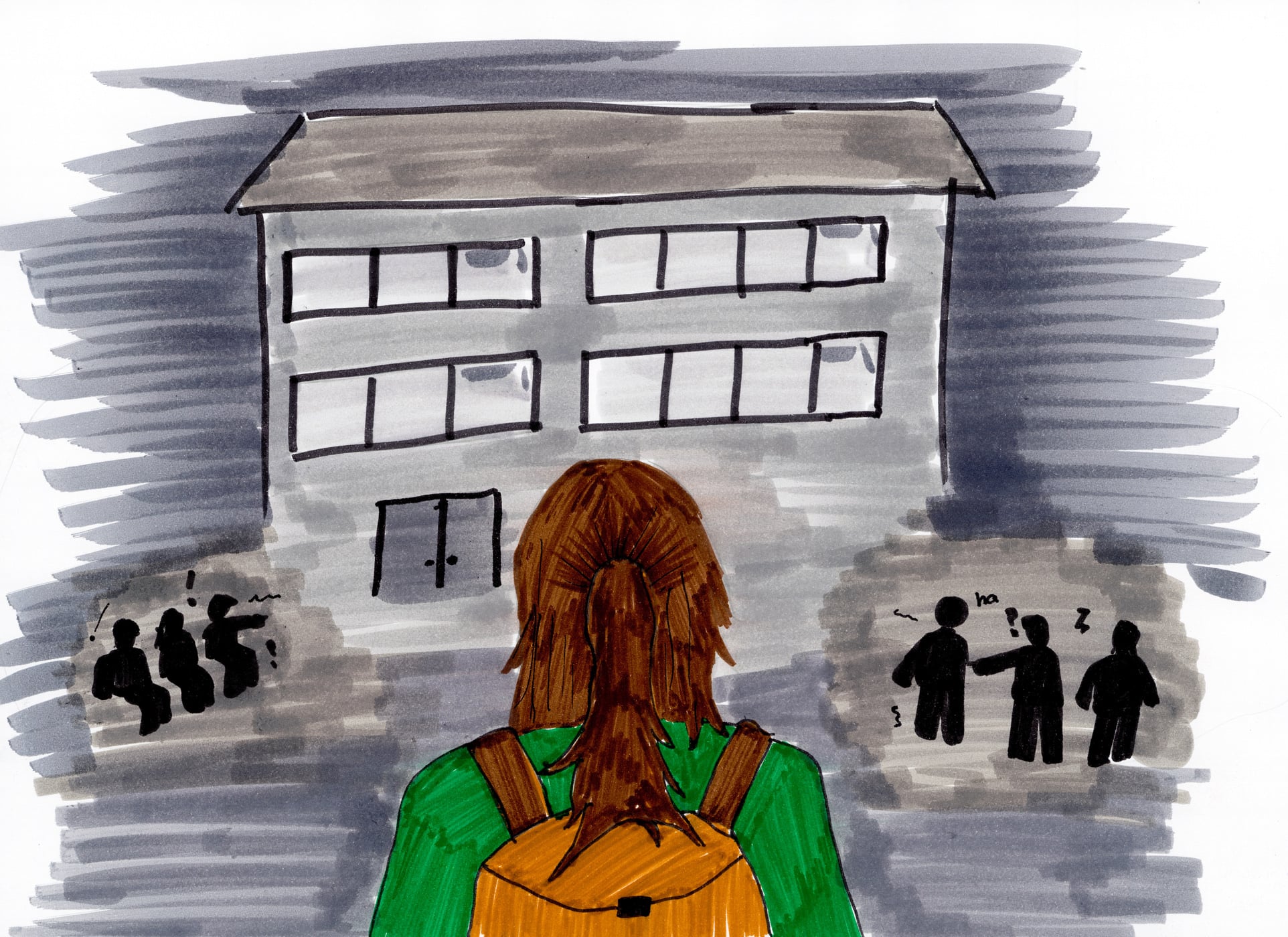 Am ersten Schultag wolltest du nicht in die Schule, weil du Angst hast, was passiert. Beim Frühstück war es so still dass du Angst bekamst, dass du plötzlich einfach irgendetwas gesagt hast. Nach dem Frühstück hast du deine Sachen gepackt und deine Mutter hat dich in die neue Schule gefahren.